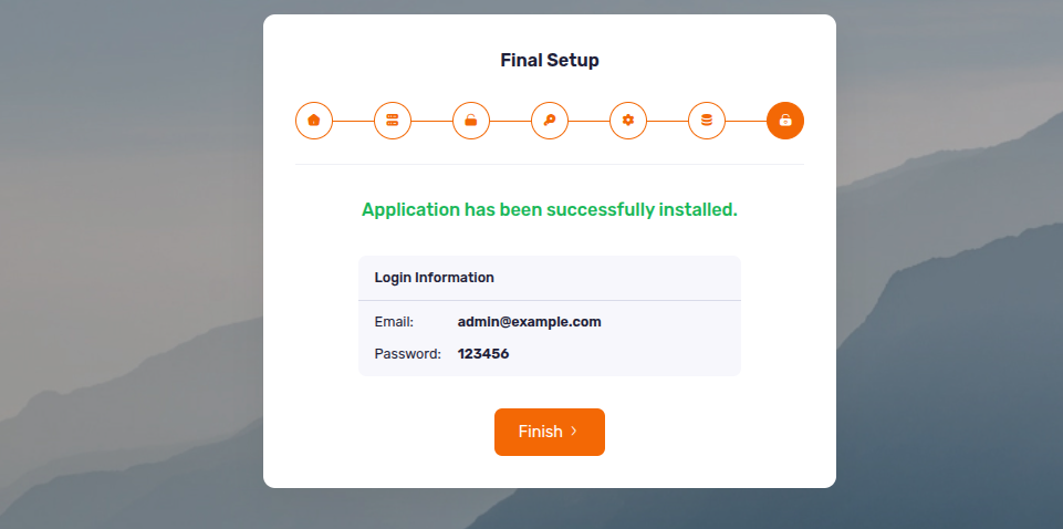- Now you will see the login information (Email : admin@example.com, Password : 123456) then click “Finish” to exit
