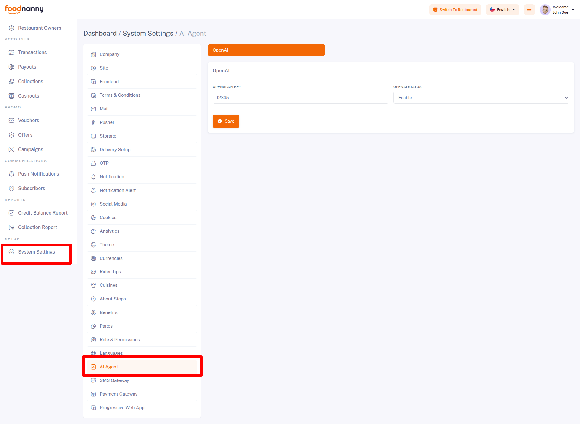 Navigate to Admin Panel → System Settings → AI Agent. Enter your API Key in the field and click Save.