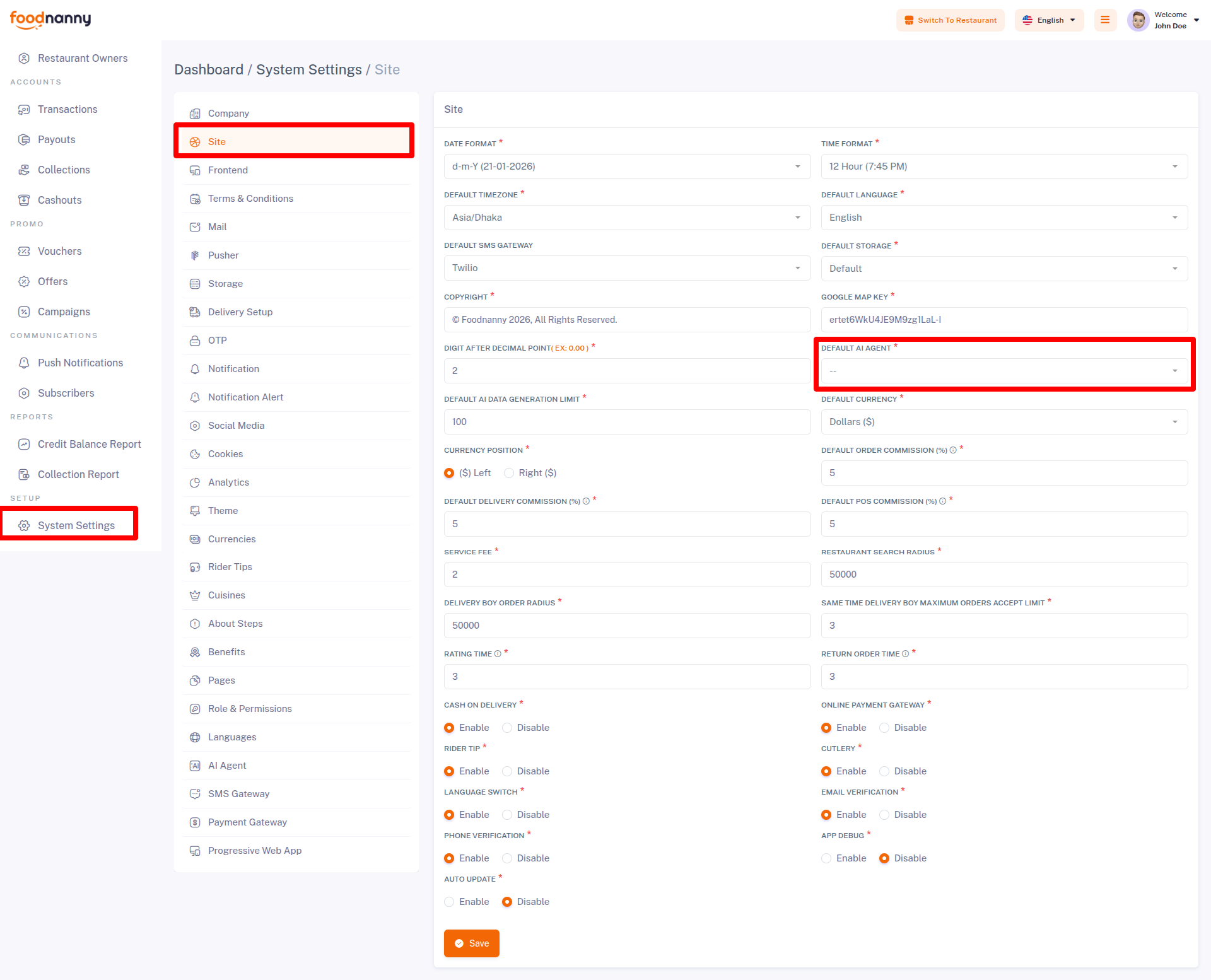 Within the administrative panel, we provide a designated section known as "System Settings." This particular area empowers you to configure various essential aspects of your business, such as your Company, Site, Frontend, Terms & Conditions, Mail, Pusher, Storage, Delivery Setup, OTP, Notification, Notification Alert, Social Media, Cookies, Analytics, Theme, Currencies, Rider Tips, Cuisines, About Steps, AI Agent, Benefits, Pages, Role & Permissions, Languages, SMS Gateway, Payment Gateway.