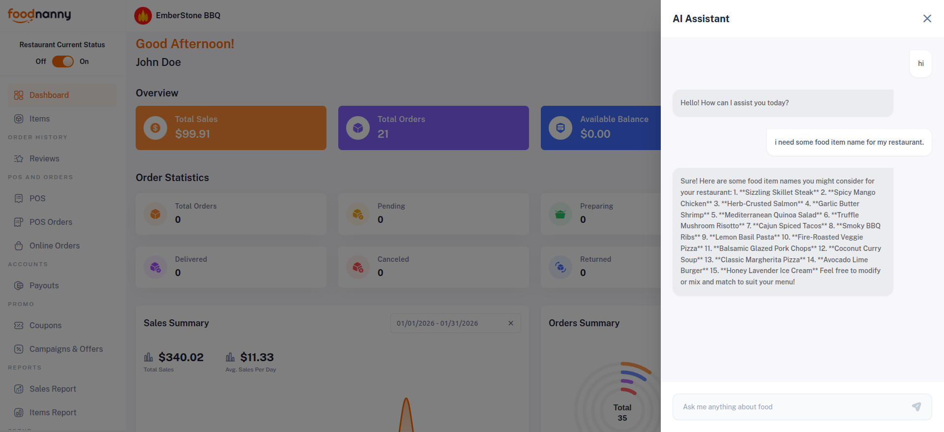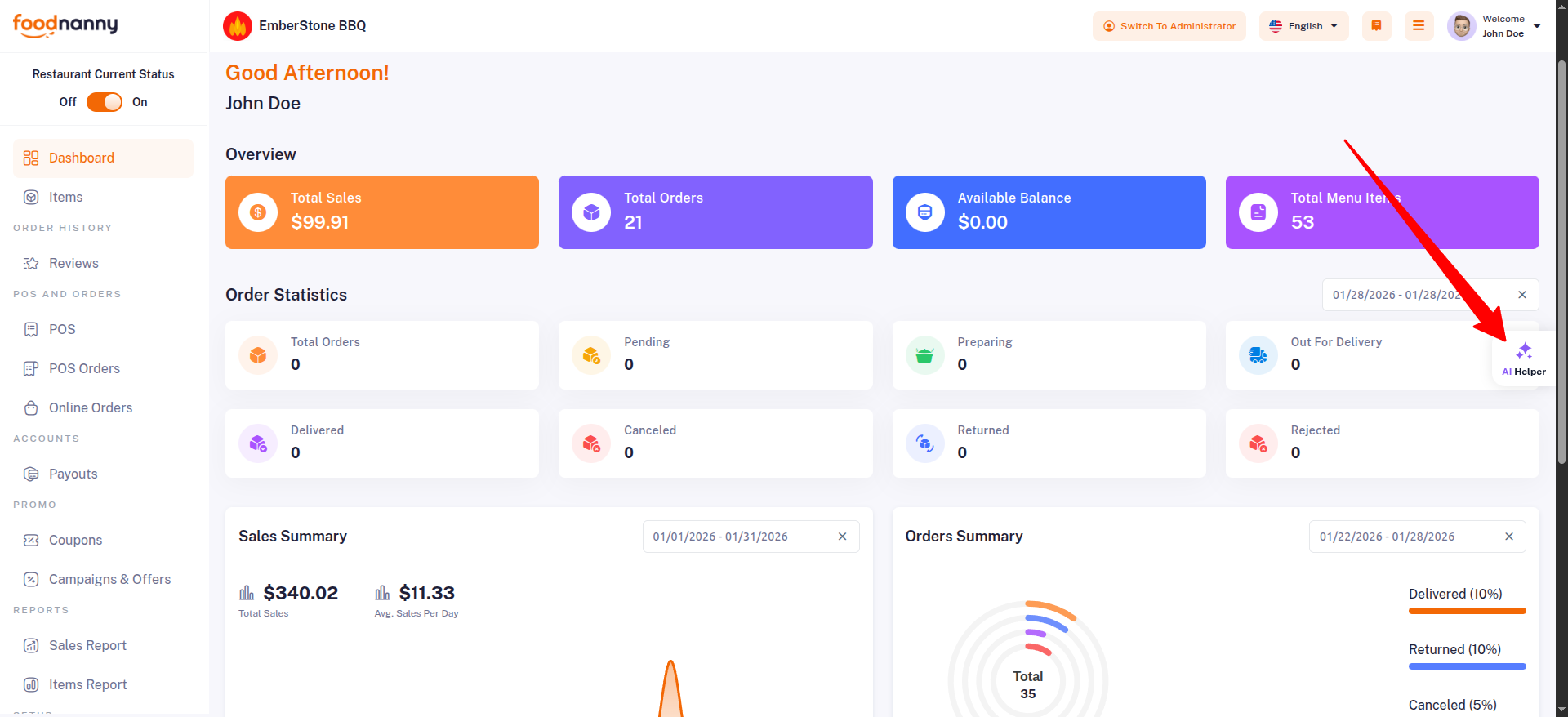 Once configured, Restaurant Owners can access the AI features from their respective panels. A smart AI Helper icon will be available on the right side of the dashboard.