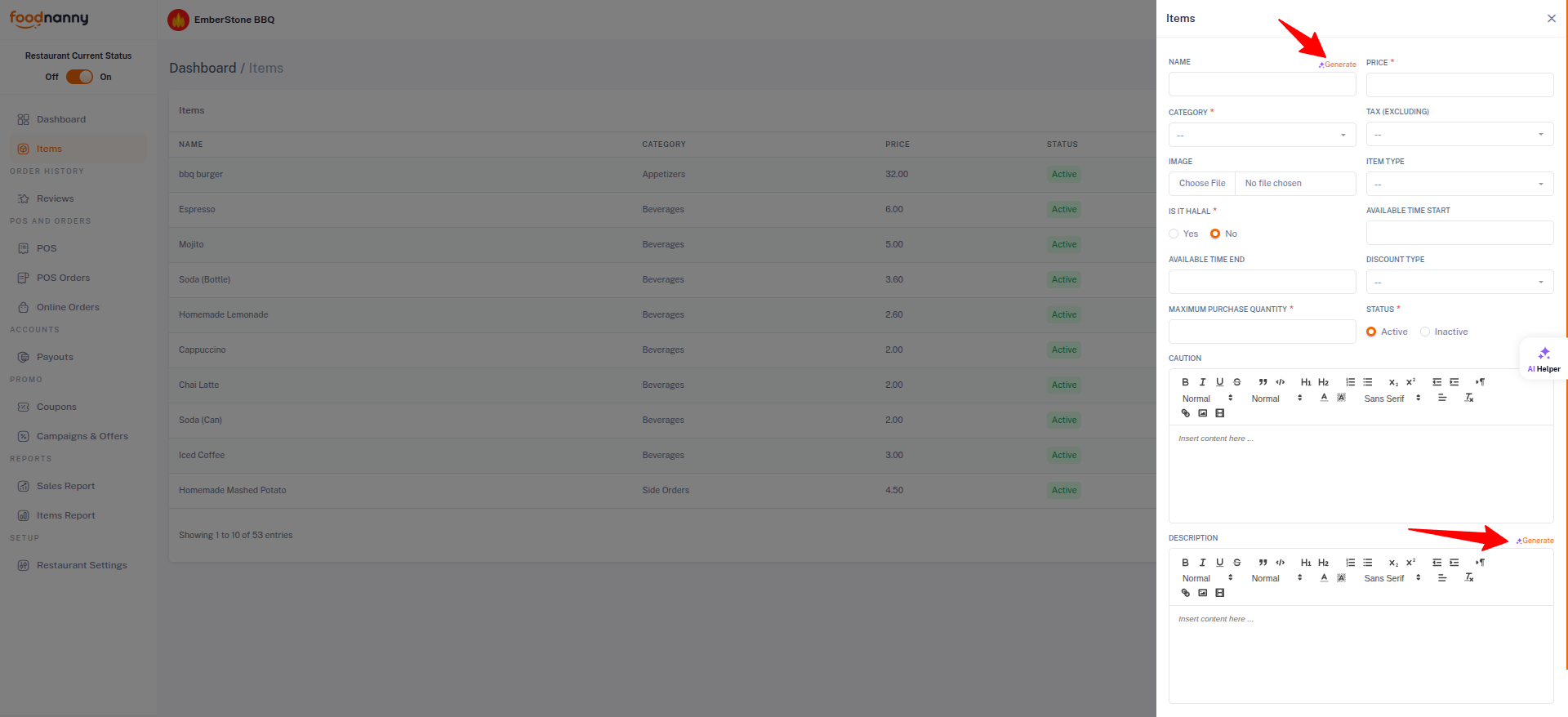 Additionally, the AI integration helps in streamlining menu management. Owners can use the AI to generate attractive Item Names and professional Descriptions during the creation or editing of food items.
